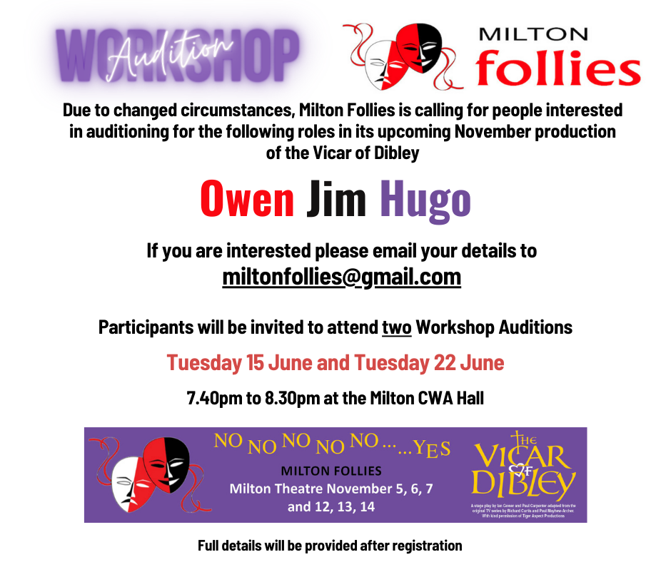 Audition Workshops May 13, 2021 Written by miltonfollies Share this: Email a link to a friend (Opens in new window) Email Share on X (Opens in new window) X Share on Facebook (Opens in new window) Facebook More Print (Opens in new window) Print Like Loading...