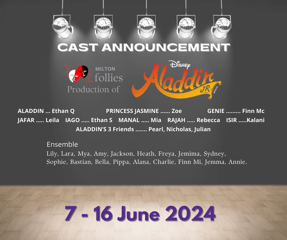 Congratulations to the successful cast members of Aladdin Junior. Milton Follies would like to thank all those who auditioned.