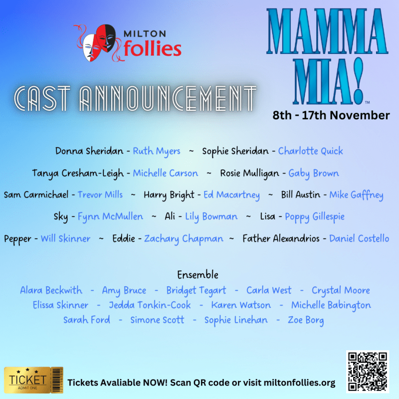 Mamma Mia Cast Announcement July 15, 2024November 9, 2024 Written by miltonfollies Share this: Click to email a link to a friend (Opens in new window) Email Click to share on X (Opens in new window) X Click to share on Facebook (Opens in new window) Facebook More Click to print (Opens in new window) Print Like Loading...